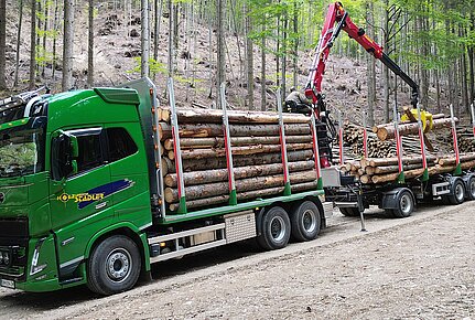 Damit die unterschiedlichen Holzlängen auch optimal auf den Rungenstöcken aufliegen, sind diese auf dem Fahrgestellrahmen verschiebbar.