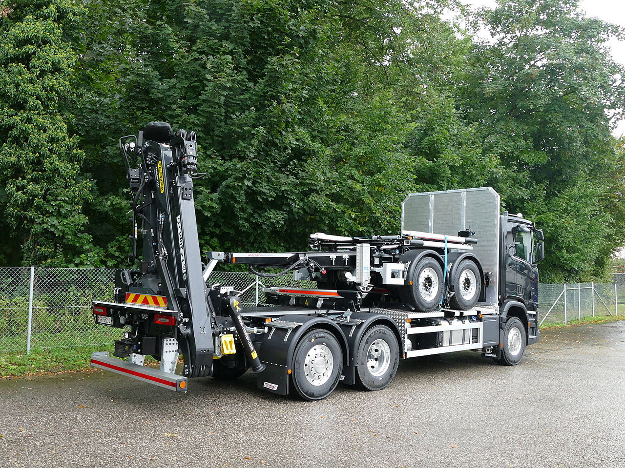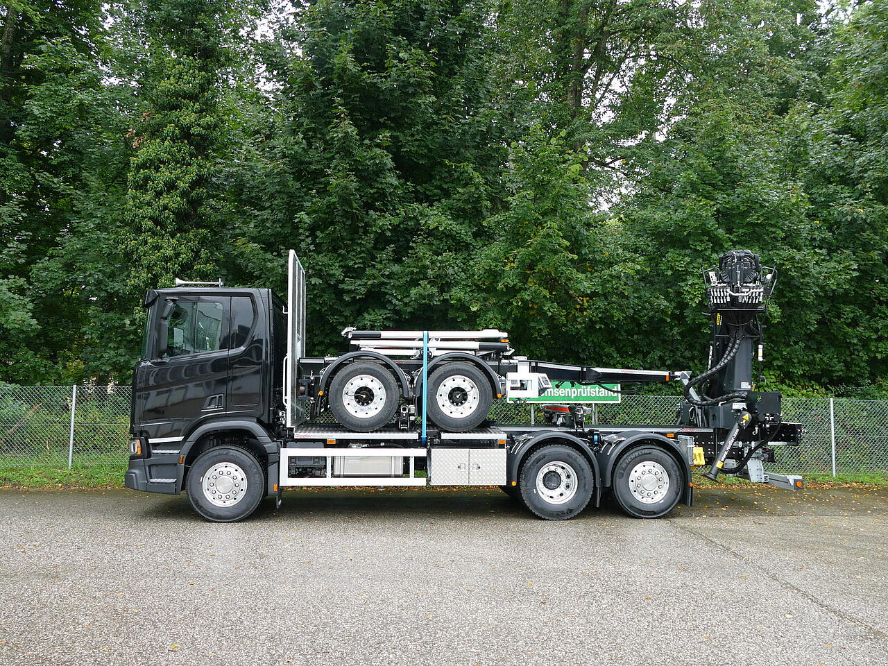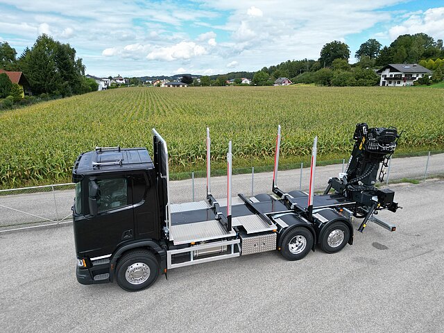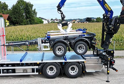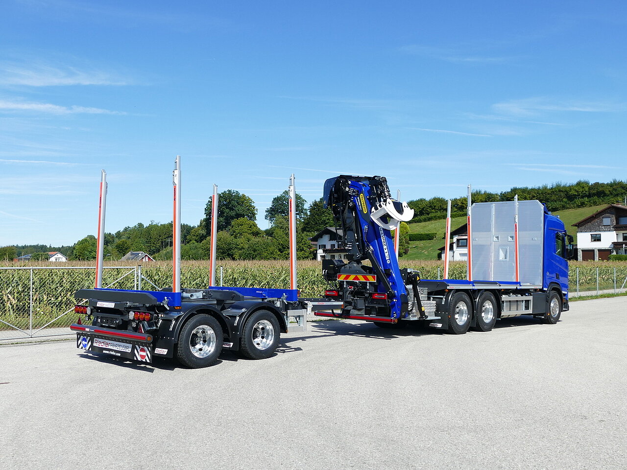 Unser Unternehmen ist für maßgeschneiderte Rungenfahrzeuge für den Holztransport über die Landesgrenzen hinweg bekannt. Für zwei unserer Schweizer Kunden realisierten wir im Herbst 2025 Lösungen, die die Mautkosten bei Leerfahrten senken: Der Rungenanhänger wird dazu bei Bedarf einfach mit dem am Fahrzeug montierten Holzladekran auf die Ladefläche des LKW´s gehoben – die Rückfahrt erfolgt damit nur als Motorwagen und nicht als Zug.