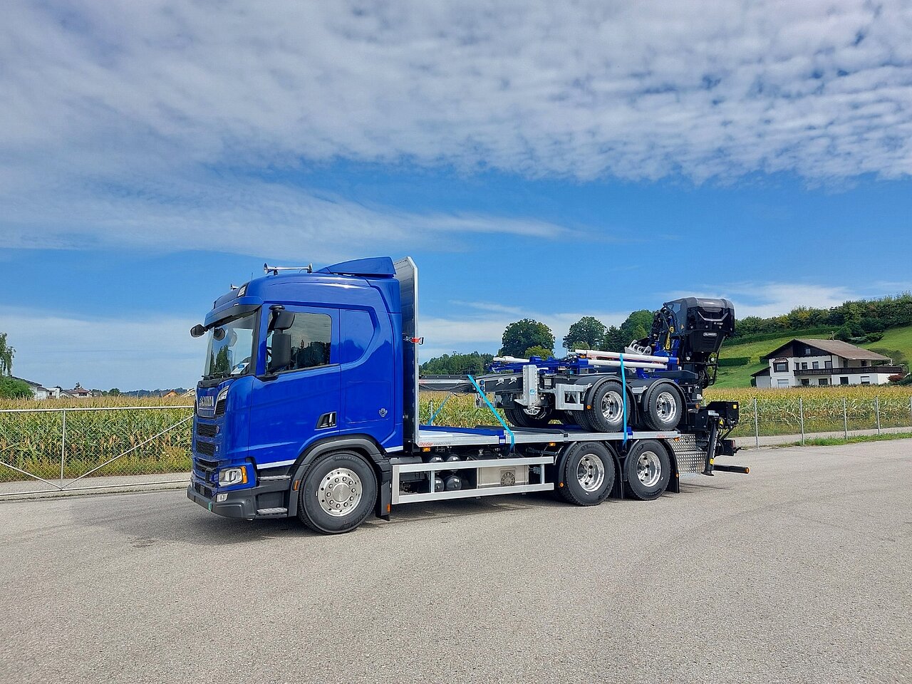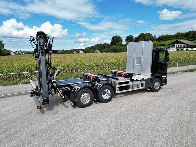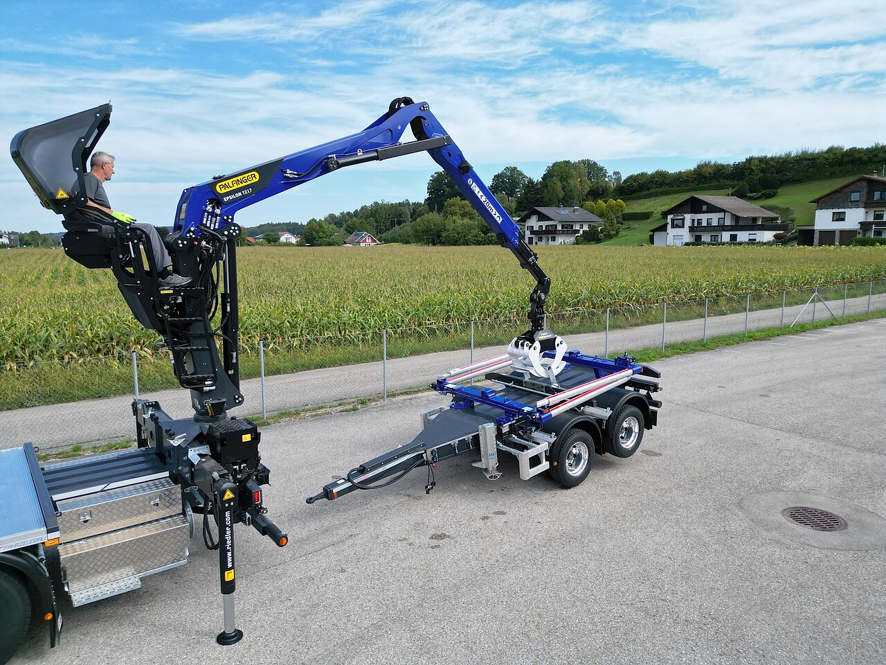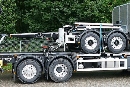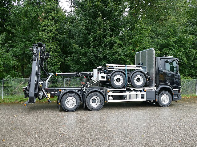 Unser Unternehmen ist für maßgeschneiderte Rungenfahrzeuge für den Holztransport über die Landesgrenzen hinweg bekannt. Für zwei unserer Schweizer Kunden realisierten wir im Herbst 2025 Lösungen, die die Mautkosten bei Leerfahrten senken: Der Rungenanhänger wird dazu bei Bedarf einfach mit dem am Fahrzeug montierten Holzladekran auf die Ladefläche des LKW´s gehoben – die Rückfahrt erfolgt damit nur als Motorwagen und nicht als Zug.