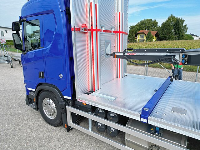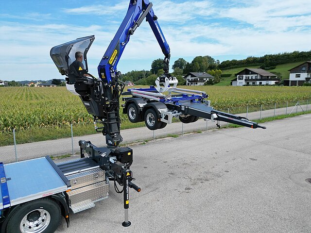 Zunächst müssen beim Aufbau wie auch beim Anhänger die Alu-Teleskoprungen eingeschoben werden und die Rungenstöcke am Anhänger per Hand aus umgeklappt werden. Danach werden die Rungen des Aufbaues über einen Steuerschieber vom Kransitz ganz einfach und kräfteschonend quer zur Fahrtrichtung umgelegt. Anschließend wird der Tandem-Rungenanhänger wie schon zuvor beschrieben mit dem Holzladekran auf den Aufbau geladen und über den Rungen abgestellt. Bei dieser Ausführung muss der Anhänger allerdings mit dem Heck nach vorne auf der Ladefläche positioniert werden. Dies hängt mit der Bauweise des Aufbaues zusammen, da dieser über kein durchgehendes Plateau verfügt. Dazu wird das Heck des Anhängers in einer Ausbuchtung in der Stirnwand zentriert, die Zugöse in einer hochklappbaren Auflage vor dem Kran gesichert und der Anhänger mit einem Spanngurt niedergezurrt.