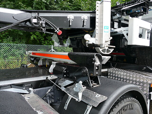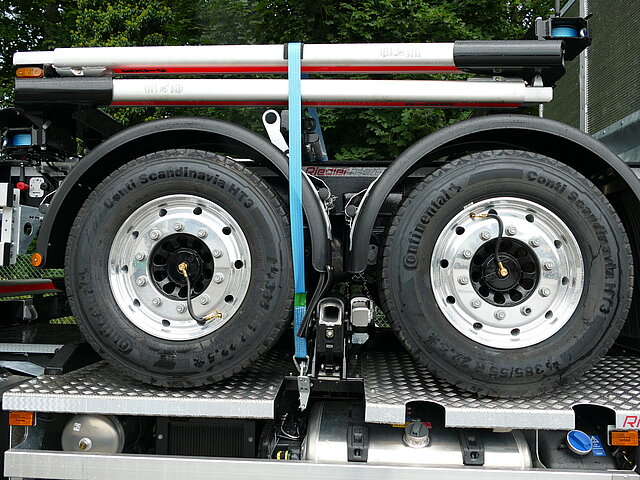 Zum Abstellen des Anhängers auf dem Aufbau wird zunächst die Zugöse des Anhängers über einen in der Stirnwand integrierten Bolzen eingefädelt. Danach kann der Anhänger mühelos und exakt auf der Ladefläche abgestellt werden. Anschließend wird noch die Luftfederung des Anhängers abgesenkt, und der Anhänger mit zwei Zurrgurten gegen seitliches Verrutschen gesichert. Das Ganze dauert dabei nur wenige Minuten.