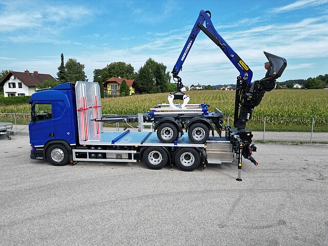 Bei der zweiten Huckepack-Lösung kommt ein völlig anderes Konzept beim Aufbau zum Einsatz. Hier kommen auf dem Riedler-Aufbau ohne durchgehendes Plateau zwei ExTe-Klappschemel zum Einsatz. Diese wurden zunächst auf eine hydraulische Ausführung umgerüstet um die Rungen später bequem vom Kransitz aus umklappen zu können.